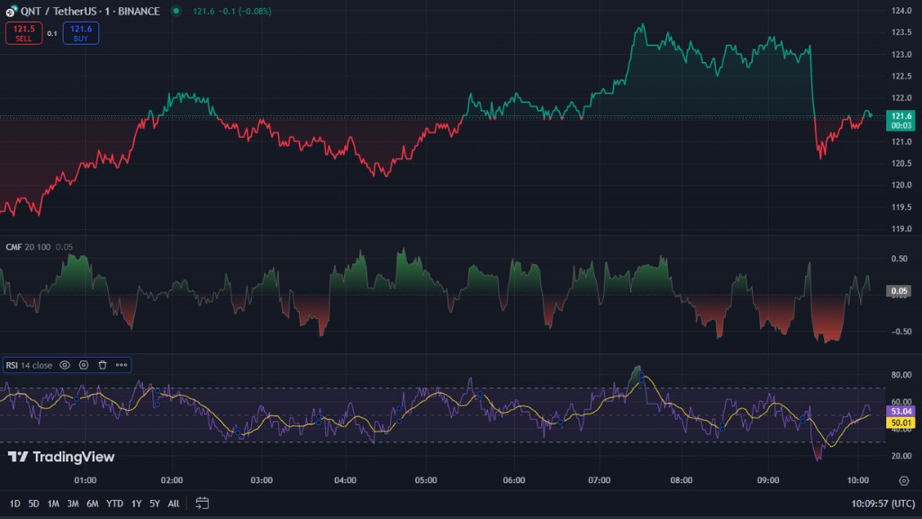 نمودار ۴ ساعته نشان دهنده علائم صعودی است. شاخص جریان پول چایکین (CMF) به ۰.۲۰ رسیده است که نشان دهنده فشار خرید بالا و افزایش جریان سرمایه به این دارایی است. از طرفی، شاخص قدرت نسبی (RSI) نیز این روندد صعودی را تایید میکند و به محدوده ۵۲ رسیده است. شاخص RSI همچنین نشان میدهد که با وجود افزایش قیمت اخیر، کوانت هنوز بیش از حد خریداری نشده و جا برای ادامه روند صعودی باقی است.
