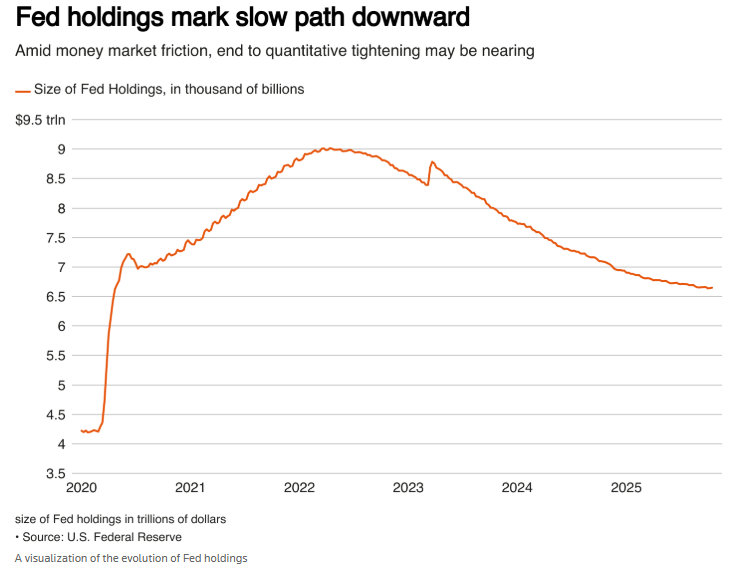 هیز انتظار دارد افزایش نقدینگی دلار آمریکا که به کف رسیده، همراه با پایان سیاست «کوچکسازی ترازنامه بانک مرکزی» (QT)، موج بعدی صعود بیت کوین را شکل دهد. فدرال رزرو در ماه اکتبر نرخ بهره را ۰.۲۵ درصد کاهش داد و عملاً سیگنال داد که دوره کاهش شدید نقدینگی رو به پایان است. طبق دادههای پالب مارکت هم احتمال ۸۷ درصدی وجود دارد که فدرال رزرو تا ۱۰ دسامبر دوباره نرخ بهره را کاهش دهد. تحلیلگران حتی پیشبینی میکنند که QT ممکن است از اول دسامبر متوقف شود.