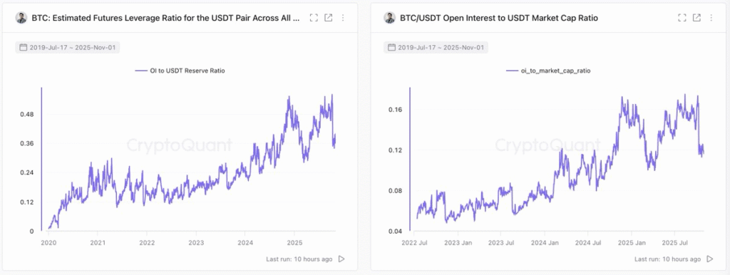 در عین حال، اهرم معاملات دائمی بیت کوین همچنان بالاست و نسبت موقعیتهای باز به موجودی تتر در صرافیها نشان میدهد سطح ریسک بازار حتی از دو سال پیش نیز بیشتر است.