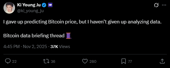 در سوم نوامبر ۲۰۲۵، «کی یانگ جو» مدیرعامل پلتفرم تحلیلی کریپتوکوانت، مجموعهای از دادههای آنچین درباره وضعیت بیت کوین را منتشر کرد که نگاه تازهای به وضعیت فعلی بازار این رمزارز ارائه میدهد.