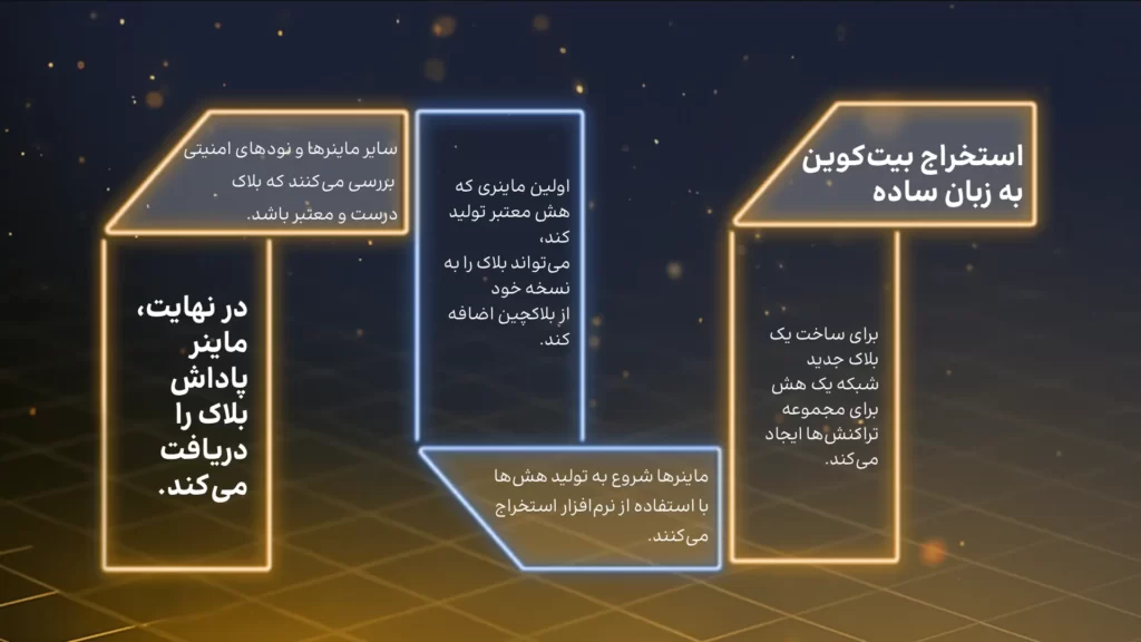بیت کوینها با فرآیندی به نام «ماینینگ» یا استخراج به وجود میآیند؛ جایی که ماینرها با حل معادلات رمزنگاریشده، بلاکهای جدید را به بلاکچین اضافه میکنند و در ازای آن پاداش میگیرند.