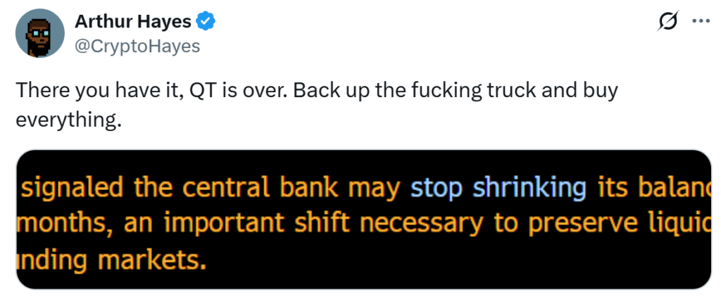 کاهش نرخ بهره معمولاً برای بازار رمزارزها خبر خوبی است، چرا که ارزانتر شدن هزینه وام گرفتن باعث میشود سرمایهگذاران تمایل بیشتری به داراییهای پرریسک، از جمله رمزارزها، داشته باشند. علاوه بر این، فدرال رزرو اعلام کرده از اول دسامبر برنامه «انقباض ترازنامه» یا همان سیاست پولی انقباضی (QT) را متوقف میکند؛ اقدامی که در واقع تزریق نقدینگی را به بازار تسهیل میکند و میتواند باعث ورود سرمایه به داراییهای جایگزین مانند بیت کوین شود.