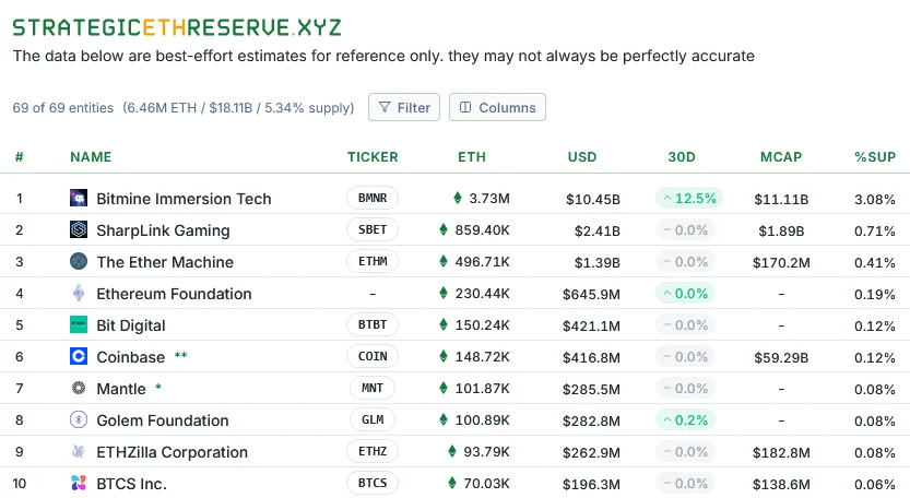 بر اساس گزارش strategicethreserve.xyz، شرکت Bitmine با اختلاف قابل توجهی بزرگترین شرکت هولدر اتریوم در جهان است.