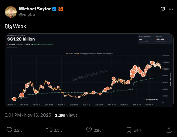 با این حال، فضای شوکآلود بازار خیلی زود با یک پیام کوتاه اما پررمز و راز از طرف خود سایلر تغییر کرد. او تنها با انتشار دو کلمه Big week موج جدیدی از حدسوگمان را به راه انداخت. عدهای معتقدند MicroStrategy از ریزش اخیر استفاده کرده و بار دیگر بیتکوین خریده است؛ برخی دیگر نیز انتظار اعلامیهای مهم از سوی این شرکت را دارند. در هر دو حالت، پیام سایلر بیش از آنکه توضیحدهنده باشد، باعث افزایش هیجان و تعلیق شد.