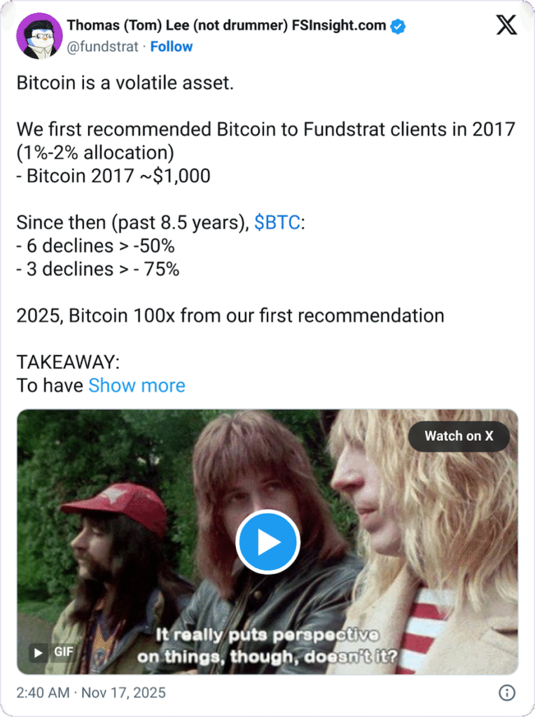 در سوی دیگر بازار، تحلیل جسورانهای از تام لی توجهها را به خود جلب کرد. او در یک پست X ادعا کرد اتریوم اکنون دقیقاً روی همان مسیر بنیادی قرار گرفته که بیتکوین را از ۱٬۰۰۰ دلار در سال ۲۰۱۷ به بیش از ۱۲۶ هزار دلار در ۲۰۲۵ رساند؛ رشدی ۱۰۰ برابری.
