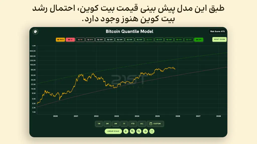 برای پیدا کردن بهترین زمان خرید بیت کوین، میتوانید به شاخصهای آنچین توجه کنید. مثلا طبق مدل Quantile بیت کوین، اکنون شاخص ریسک بیت کوین ۴۱ درصد است و احتمال رشد بیت کوین همچنان وجود دارد. این نمودار را میتوانید از وبسایت 21stcapital بررسی کنید. به عقیده اکثر فعالان بازار رمزارز، بهترین ارز دیجیتال برای سرمایه گذاری با پول کم بیت کوین است.