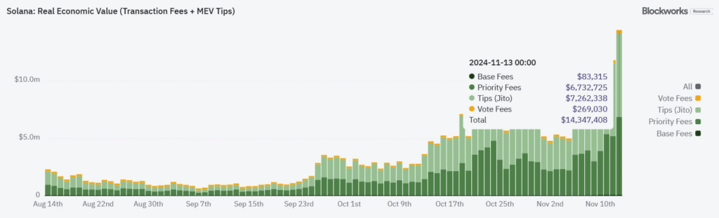اول از همه، به سراغ استیکینگ برویم؛ با این تأکید مهم که استیکینگ، سود اقتصادی خالص نیست. در شبکه سولانا، تقریباً ۴۱۹ میلیون SOL استیک شده. با فرض نرخ سالانه حدود ۶ درصد، سالانه حدود ۲۵ میلیون SOL به عنوان پاداش استیکینگ توزیع می‌شود. اگر قیمت تقریبی ۱۴۰ دلار برای هر SOL در نظر بگیریم، این رقم چیزی در حدود ۳.۵ میلیارد دلار پاداش سالانه می‌شود.