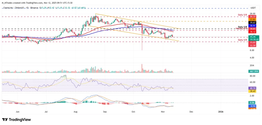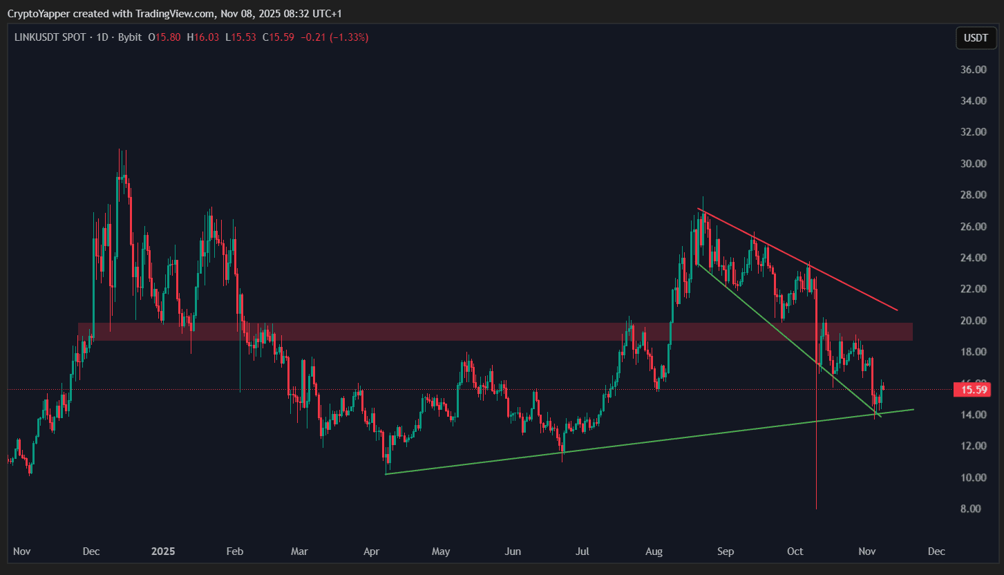 قیمت لحظهای چین لینک حدود ۱۴.۸۳ دلار است. فصل اول پاداشها از ۱۱ نوامبر برای استیکرهای LINK فعال میشود و امکان تخصیص پاداش پروژههای Build را فراهم میکند؛ همین موضوع میتواند کاتالیزور فاندامنتال کوتاهمدت برای توجه بازار به حساب آید. در تحلیل تکنیکال، ۱۵ دلار حمایت نزدیک محسوب میشود و بالای ۱۶ تا ۱۶.۵ دلار میتواند راه برای ۱۸ تا ۲۰ دلار را باز کند؛ ازدستدادن ۱۵ دلار خطر نوسان به ۱۳.۸ تا ۱۴.۲ را افزایش میدهد.