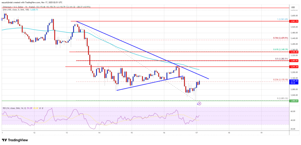 قیمت فعلی اتریوم حدود ۳٬۰۰۱.۵۷ دلار است؛ اوج روز ۳٬۲۱۵.۶۷ و کف روز نزدیک ۲٬۹۵۶.۹ دلار ثبت شده است. در روزهای اخیر، ETH چند بار زیر ۳٬۰۰۰ دلار رفته و دوباره این سطح را پس گرفته، اما ETFهای اتریوم هم مانند بیتکوین با خروج سرمایه سنگین مواجه بودهاند.