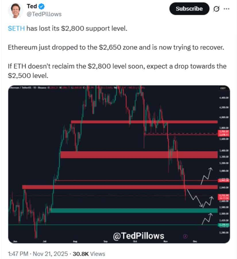اتریوم از نظر فاندامنتال همچنان ستون اصلی DeFi و لایههای دوم است؛ حجم فعالیتهای آنچین و ارتقاهای شبکه، از جمله بحث ارتقاهای بعدی و رشد لایه۲ها، چشمانداز بلندمدت را مثبت نگه داشته، اما در کوتاهمدت، فشار فروش ETFها و جو کلی بازار دست بالا را دارند. از نظر تکنیکال، تصویر فعلی تقریباً چنین است: