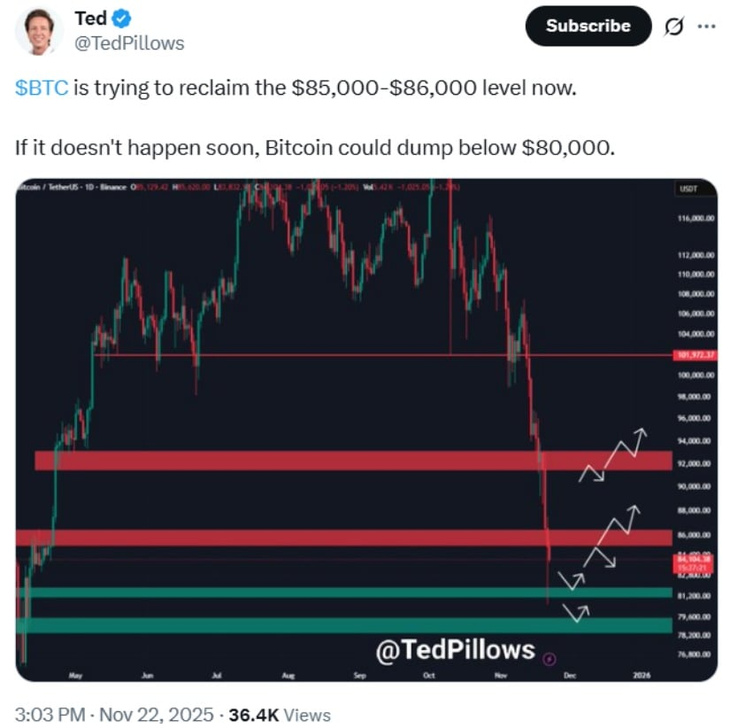 ناحیه حمایت مهم در محدوده ۸۳٬۵۰۰ تا ۸۵٬۰۰۰ دلار که تحلیلگران Investing آن را مرز تصمیم برای ادامه اصلاح یا شروع بازپسگیری قویتر میدانند. مقاومت کوتاهمدت در منطقه ۸۸٬۰۰۰ تا ۹۰٬۰۰۰ دلار که تحلیل Brave New Coin مشخص کرده و طی ۲۴ تا ۴۸ ساعت اخیر چند بار لمس شده و فعلا سد راه ادامه رشد بوده است. در سناریوهای بدبینانه Forex24، تحلیل تکنیکال کلاسیک اهدافی مثل ۷۲٬۰۰۰ دلار را هم به عنوان حمایت پایینتر و بعدی مطرح کرده است.