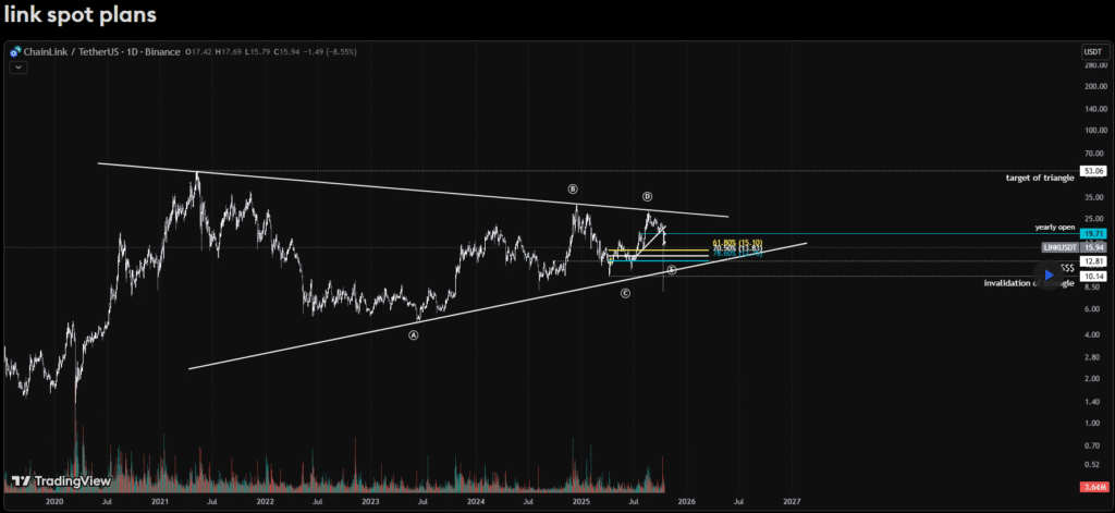 از نظر قیمت، تحلیلهای اخیر میگویند LINK بعد از بازیابی از روند نزولی چندساله، الآن در فاز تجمیع (consolidation) بین محدودههای حمایتی و مقاومتی مشخص قرار دارد و دادههای آنچین نشانههایی از انباشت (accumulation) نشان میدهند.میتوان یک حمایت مهم را در حوالی ۱۱ دلار و مقاومتها را در محدوده ۱۳.۵ تا ۱۵ دلار و سپس سطوح بالاتر ۱۸ تا ۲۰ دلار در نظر گرفت.