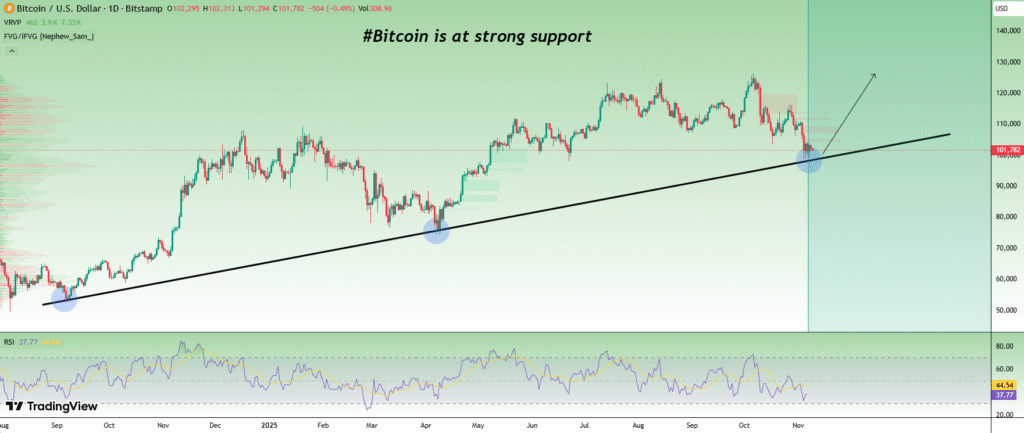 قیمت لحظهای بیت کوین حدود ۱۰۱,۸۷۰ دلار است. بازار امروز زیر فشار ریسکگریزی است و ETFهای اسپات (BTC+ETH) دیشب رویهم نزدیک به ۸۰۰ میلیون دلار خروج ثبت کردند؛ عاملی که احساسات را به «ترس شدید» کشانده است. از نظر تکنیکال، ۱۰۰,۰۰۰ دلار حمایت روانی/قیمتی حیاتی است؛ ازدستدادن قاطع آن میتواند مسیر را تا محدودههای ۹۲ تا ۹۸ هزار دلار باز کند. در طرف مقابل، بازپسگیری ۱۰۷ تا ۱۱۰ هزار دلار برای پایاندادن به روند اصلاحی کوتاهمدت ضروری است.