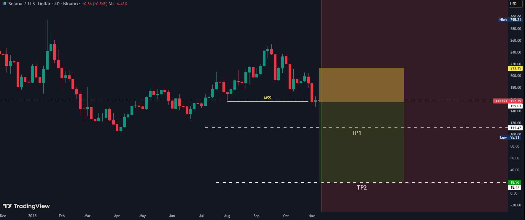 قیمت لحظهای سولانا حدود ۱۵۶ دلار است. پس از اوجگیری چندماهه اکوسیستم، دادههای فعالیت کاربری در Q3 افت معناداری نشان میدهد و مومنتوم کوتاهمدت تضعیف شده است. در نمودار روزانه، فشردگی بین ۱۸۵ تا ۲۱۰ دلار بهعنوان رِنج کلیدی/مقاومت در بالا و حمایتهای ۱۷۷ تا ۱۶۹ و سپس ۱۶۰ تا ۱۵۵ دلار در پایین رصد میشود. عبور قدرتمند بالای ۲۰۰ تا ۲۱۰ دلار میتواند سناریوی بازگشت روند را دوباره فعال کند.