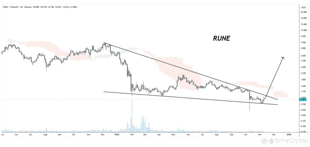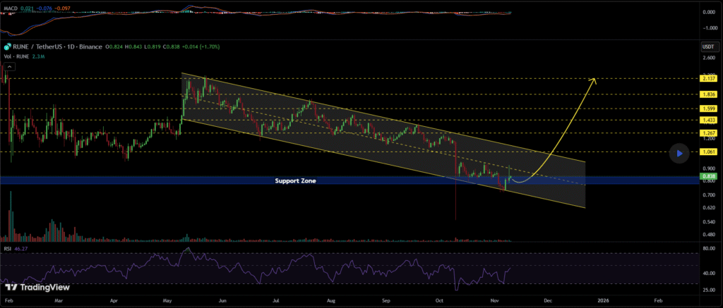 ارز RUNE در واچ لیست امروز بهواسطه نقش زیرساختی در سواپ میانزنجیرهای و بهروزرسانیهای اخیر هسته (نسخههای ۳.x) مطرح است؛ اما در قیمت، رنجهای باریک و واکنش به آستانههای روانی دیده میشود. برای امروز، حمایت ۰٫۷۸ تا ۰٫۸۵ و مقاومت ۱٫۰۵ تا ۱٫۲ محتمل است؛ کلید حرکت، شکست معتبر یکی از این محدودههاست.