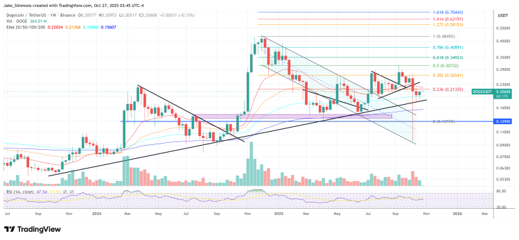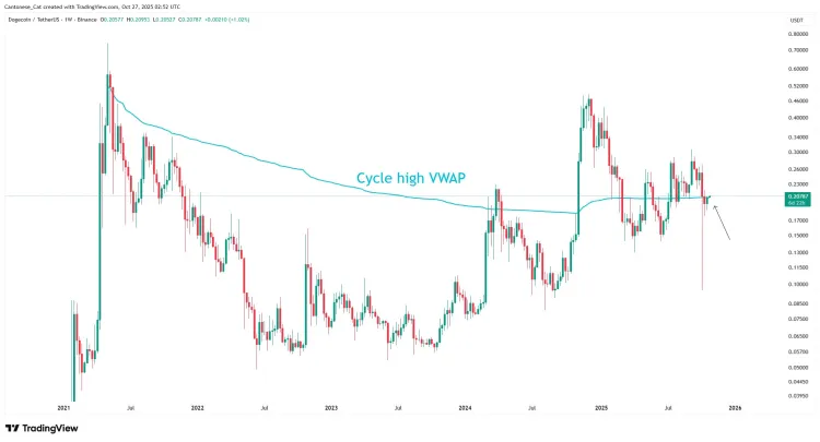 گزارشها نشان میدهند که دوج کوین در تلاش است تا میانگین وزنی حجم معاملات از سقف چرخه قبلی را به سطح حمایتی جدید خود تبدیل کند. خطوط تنکان و کیجون ایچیموکو نیز که در نمودار هفتگی در محدوده ۰.۲۰ دلار با هم تلاقی داشتند، فعلاً نقش تکیهگاه قیمت را برای دوج کوین ایفا میکنند. این وضعیت که او آن را «کاتانا» مینامد، زمانی صعودیتر میشود که قیمت بتواند خود را بالاتر از این محدوده تثبیت کند. نکته جالب دیگر، نبود حجم قابلتوجه در هنگام افت اخیر است؛ پس نشانهای که بیانگر ضعف فروشندگان و احتمال بازگشت سریع روند باشد، دیده نمیشود.