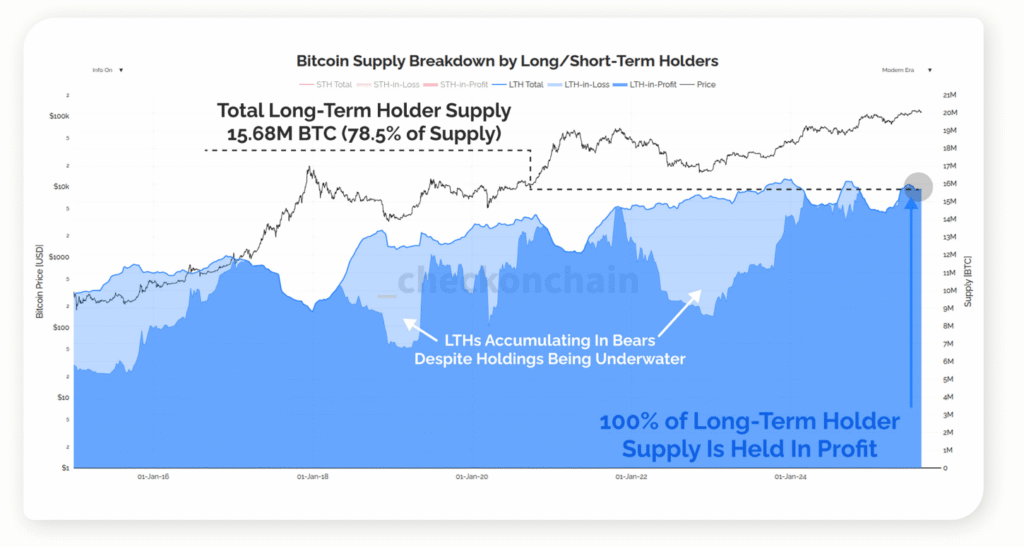 در مقابل، داده واقعیتر مربوط به هولدرهای بلندمدت (LTH) است: بیش از ۱۵.۶ میلیون بیت کوین، معادل حدود ۷۸.۵٪ از عرضه در گردش، در دست این گروه است و تقریباً همهشان در سود هستند. آنچه مسیر بازار را تعیین میکند، تصمیم همین گروه است؛ نه دادههای صرافیها.