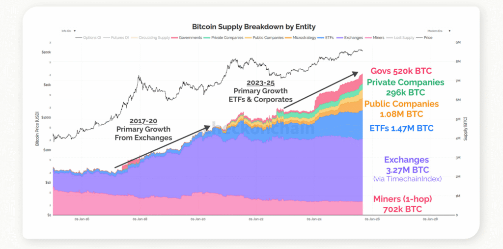 تا چند سال پیش، تحلیلگران با وسواس جریان ورودی و خروجی صرافیها را دنبال میکردند. وقتی ورودی بیت کوین به صرافیها کاهش مییافت، همه آن را نشانهای از کمبود عرضه و رشد قریبالوقوع قیمت میدانستند. اما امروز این دادهها دیگر اهمیت سابق را ندارند. طبق دادههای جدید، بیت کوینهای موجود در صرافیها حدود ۳.۴ میلیون واحد تخمین زده میشود؛ که البته صحت آن را بهسختی میتوان تأیید کرد، چرا که بیشتر صرافیها هزاران آدرس پراکنده دارند و هیچ منبع واحدی آنها را پوشش نمیدهد.