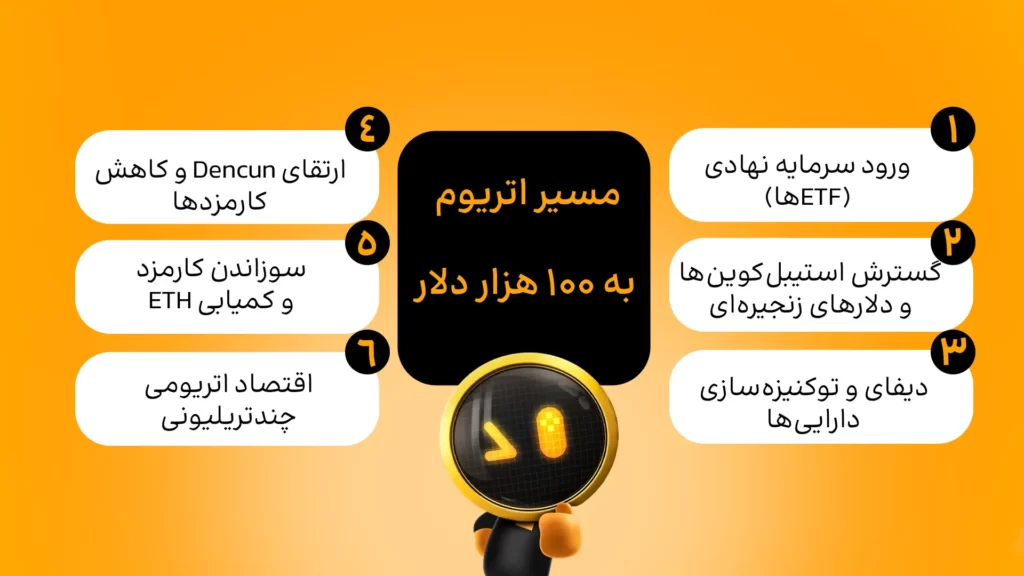 رسیدن به عددی شش‌رقمی یا همان اتریوم ۱۰۰ هزار دلاری، اتفاقی لحظه‌ای نیست. برای چنین رشد پایداری، مجموعه‌ای از محرک‌های چندگانه و هم‌زمان باید فعال شوند: