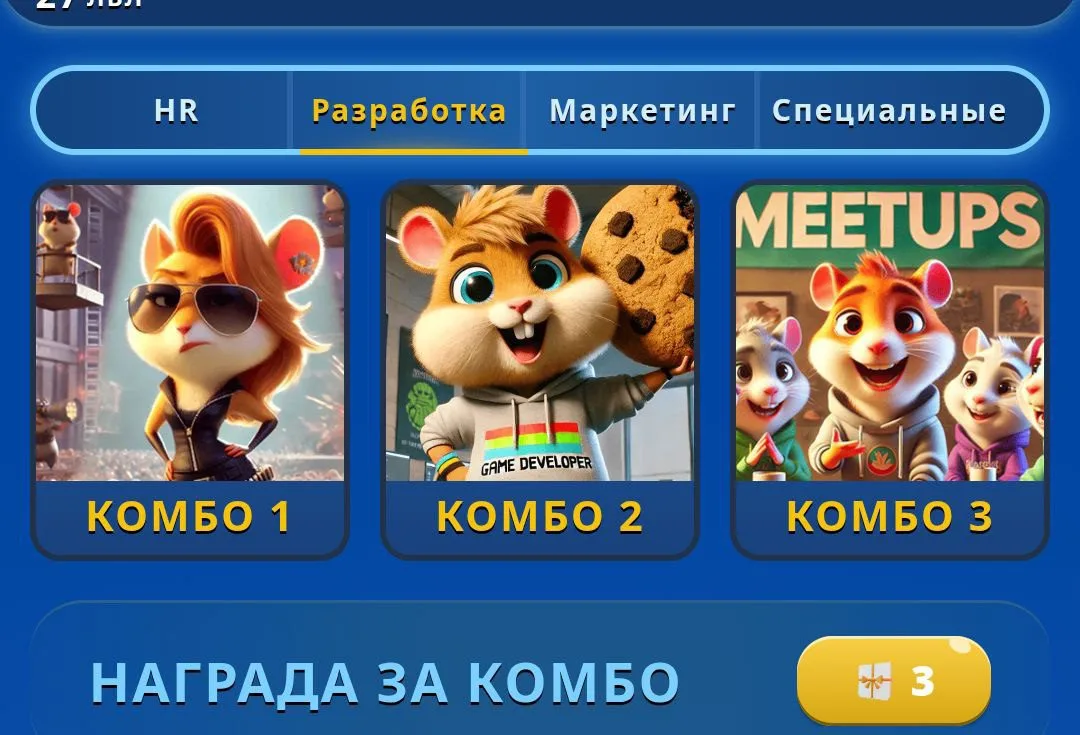 «کمبو کارت روزانه» یا «دیلی کمبو» در بازی «Hamster GameDev Heroes» از مجموعه همستر کامبت، ویژگیای است که به بازیکنان امکان میدهد با انتخاب و افزودن سه کارت مشخص در هر روز، جوایزی بهصورت تصادفی دریافت کنند. این کارتها هر روز تغییر میکنند. توجه داشته باشید که در نسخه جدید بازی، نیازی به خرید کارتها نیست و جوایز بهصورت تصادفی به شما اهدا میشوند. برای دریافت جوایز، پس از تکمیل ترکیب کارتها، به بخش «Surprise» در صفحه اصلی بازی مراجعه کرده و با کلیک روی صفحه، جوایز خود را دریافت کنید.