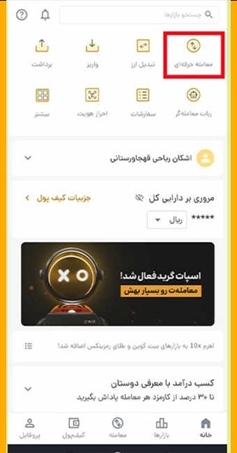 - ابتدا وارد برنامه (Application) صرافی رمزینکس شوید و در صفحه اول گزینه «معامله حرفهای» را انتخاب کنید.