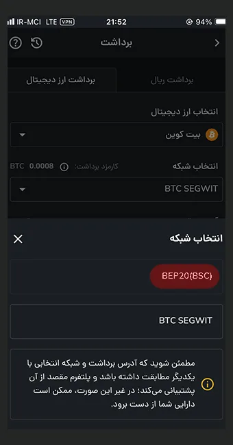 - کادر «انتخاب شبکه» را روی گزینه BTC SEGWIT قرار دهید. سگویت یک فرمت آدرس بیت کوین است؛ به این معنی که در این حالت میتوانید یک آدرس بیت کوین از نوع سگویت را وارد کنید و ارسال را به آن انجام دهید. آدرسهای سگویت با «bc1» یا «۳» شروع میشوند و از این طریق میتوانید بررسی کنید که آدرس را اشتباه وارد نکردهاید.