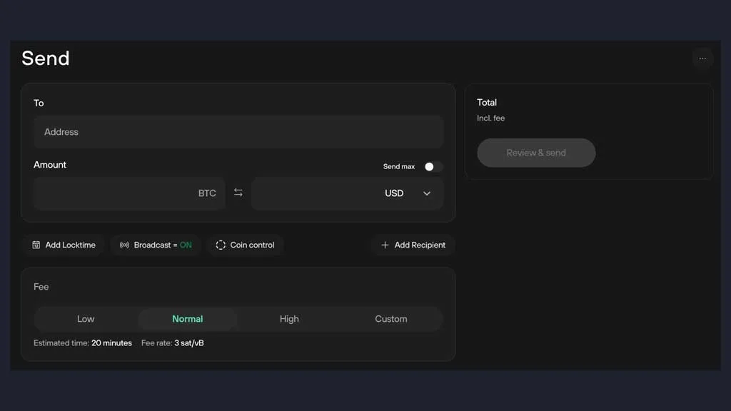 پس از وارد کردن آدرس مقصد، نوبت به تنظیم مبلغ تراکنش و بررسی میزان کارمزد میرسد. مبلغ را در بخش «Amount» وارد کنید. کیف پول شما کارمزد تراکنش را محاسبه و به شما اعلام میکند. بررسی کنید که کارمزد معقول باشد و بیشتر از حد انتظارتان نباشد. برخی از کیف پولها، این امکان را فراهم کردهاند که کارمزد را تغییر دهید. با بیشتر کردن کارمزد تراکنش شما سریعتر تایید میشود و با کمتر کردن آن، هزینه کمتری میپردازید اما ممکن است تایید شدن تراکنش زمان بیشتری طول بکشد.