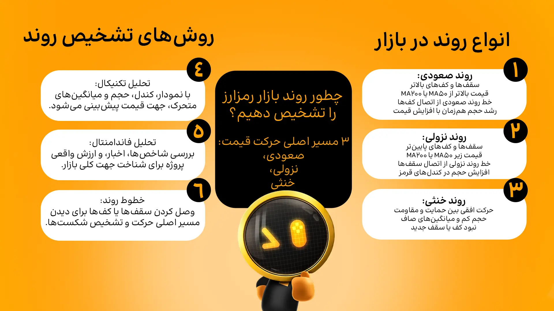 در تحلیل تکنیکال ارزهای دیجیتال مختلف، مهم‌ترین نکته که به عنوان زیرساخت تمام مسیر تحلیل محسوب می‌شود، تشخیص روند است. روند به‌طور کلی اشاره به مسیر کلی یک ارز دیجیتال در یک بازه زمانی مشخص (از چند ساعت تا چند ماه بسته به تایم فریم تحلیل) دارد. اولین قدم در تحلیل تکنیکال، تشخیص روند یک ارز دیجیتال است. با پیدا کردن روند، می‌توانید قدم‌های بعدی را در تحلیل بردارید و مواردی مانند نوع کندل، مومنتوم از طریق اندیکاتورها و مقاومت‌ها و حمایت‌های مهم را تشحیص دهید.