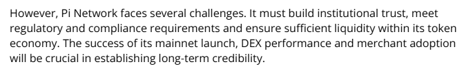 در ادامه تأکید میشود که موفقیت در راهاندازی کامل میننت (شبکه اصلی)، عملکرد مطلوب صرافی غیرمتمرکز (DEX) و پذیرش گسترده از سوی کسبوکارها و فروشندگان، عوامل کلیدی در ایجاد اعتبار و پایداری بلندمدت پای نتورک خواهند بود.