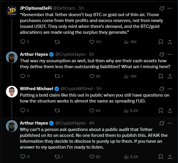 بعضی تحلیلگران به سرعت گفتند تتر برای خرید بیت کوین و طلا، USDT جدید چاپ نکرده و این دارایی‌ها را با سود و ذخایر مازادش خریده است. به بیان ساده، پشتوانه کاربران دست نخورده و بخشی از سود شرکت وارد دارایی‌های جدید شده است. اما هیز راضی نشد و پرسید اگر این‌طور است چرا مقدار دارایی نقد تتر کمتر از تعهداتش در گزارش آمده؟ او گفت وقتی گزارشی عمومی منتشر می‌شود، مردم حق دارند درباره جزئیات آن سؤال کنند.