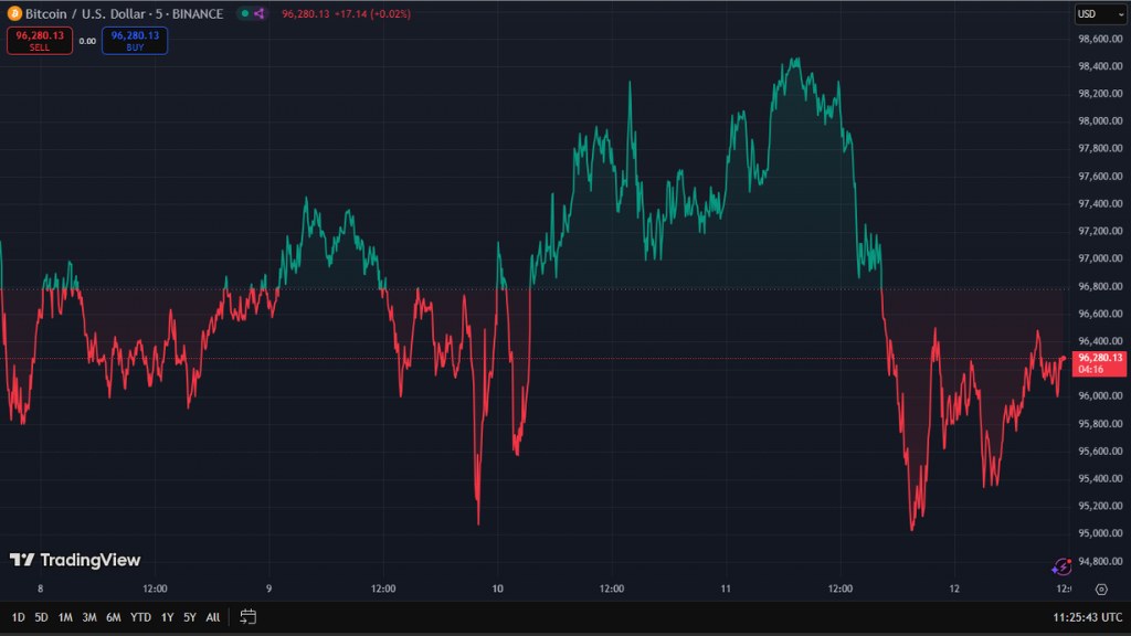 در حال حاضر، قیمت بیت کوین در حال تلاش برای افزایش است، اما تحلیلهای فنی نشان میدهد که به دلیل نوسانات ناشی از CPI، احتمالا سطح ۹۴.۶ هزار دلار را طی خواهد کرد. معاملهگران کوتاهمدت که به دنبال خرید در هنگام افت هستند، میتوانند در سطح ۹۴.۶ هزار دلار شروع به خرید کنند؛ زیرا رالی بعدی ممکن است بیت کوین را به نقطه کنش POC در ۹۶.۸ هزار دلار، قیمت میانگین وزنی حجم (VWAP) در ۱۰۰ هزار دلار و نهایتا به بالاترین سطح در ۱۰۱.۵ برساند.
