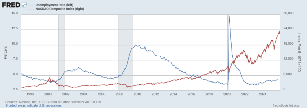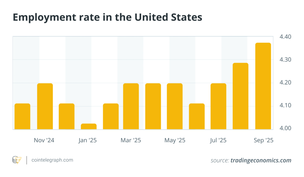 همانگونه که مشاهده میشود، نرخ اشتغال از اواخر سال ۲۰۲۴ تا پاییز ۲۰۲۵ با شیب ملایم اما پیوسته افزایش یافته است. این روند اگرچه بهمعنای رکود عمیق نیست، اما برای بازارهای ریسکی مانند کریپتو هشداری قابل تأمل به حساب میآید.