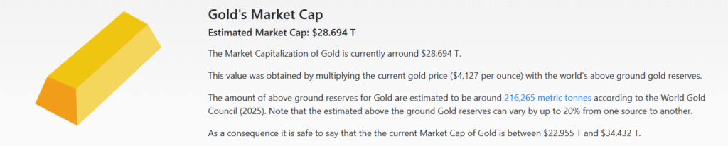 برای اینکه بفهمیم ۵٪ از بازار طلا یعنی چه، اول باید اندازه بازار را درک کنیم. تخمین ارزش تمام طلای موجود در دنیا معمولاً با این روش انجام میشود: تعداد کل طلای استخراجشده (حدود ۲۱۵ تا ۲۲۰ هزار تُن طبق برآوردهای شورای جهانی طلا در سال ۲۰۲۵) ضرب در قیمت لحظهای هر اونس. با توجه به اینکه طلا در اواخر اکتبر ۲۰۲۵ حوالی ۴٬۱۰۰ تا ۴٬۲۵۰ دلار در هر اونس معامله شده، خروجی این ضرب چیزی نزدیک ۲۹ تا ۳۰ تریلیون دلار میشود.
