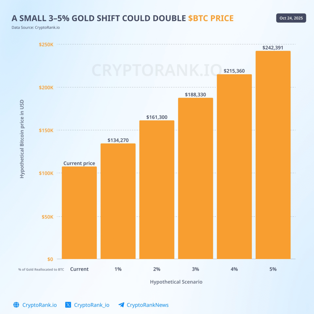 سؤال کلیدی اینجاست: آیا بخشی از پولی که تا دیروز فقط در انحصار بازار طلا بود، از این به بعد بین طلا و بیت کوین تقسیم میشود؟ اگر پاسخ حتی «بله، در حد خیلی کم» هم باشد، یعنی اگر تنها ۳ تا ۵ درصد از سرمایهای که قرنها در طلا قفل بوده به سمت بیت کوین سرازیر شود، با جابهجایی تاریخی روبهرو هستیم: مارکتکپ بیت کوین بالقوه میتواند تقریباً دو برابر شود بدون اینکه نیاز باشد دنیا از طلا دست بکشد یا بحران آخرالزمانی عجیبی رخ دهد. فقط ورود لایه جدیدی از سرمایهگذارانی که حاضر باشند هم طلا داشته باشند و هم نسخه دیجیتال و غیرقابلسانسور همان مفهوم را، کفایت میکند.