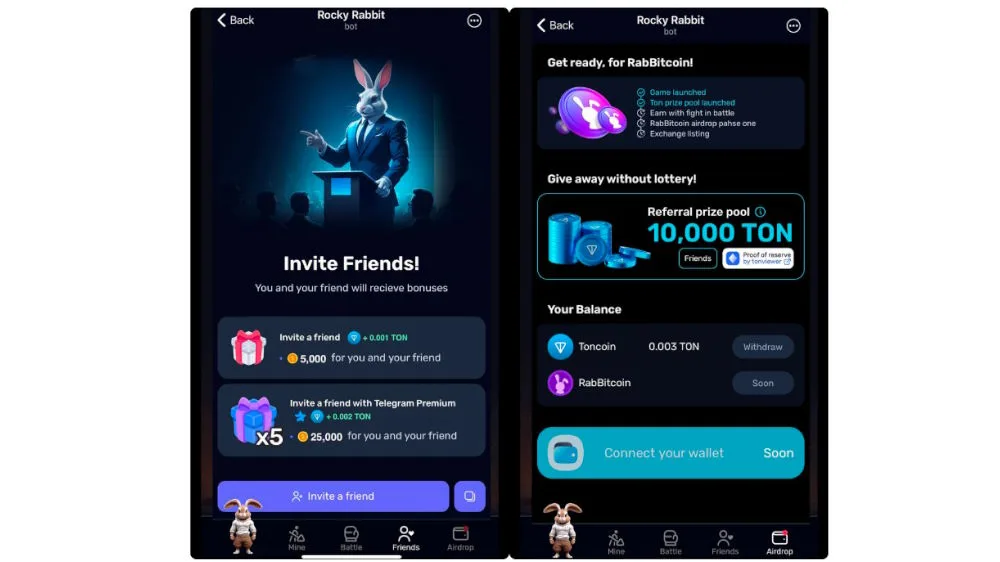- اتصال کیف پول TON (اختیاری): برای کسب و دریافت پاداش به شکل RabbitCoin یا همان RBTC، ممکن است لازم باشد کیف پول TON خود را متصل کنید. دستورالعملهای ربات را برای اتصال کیف پول خود دنبال کنید.