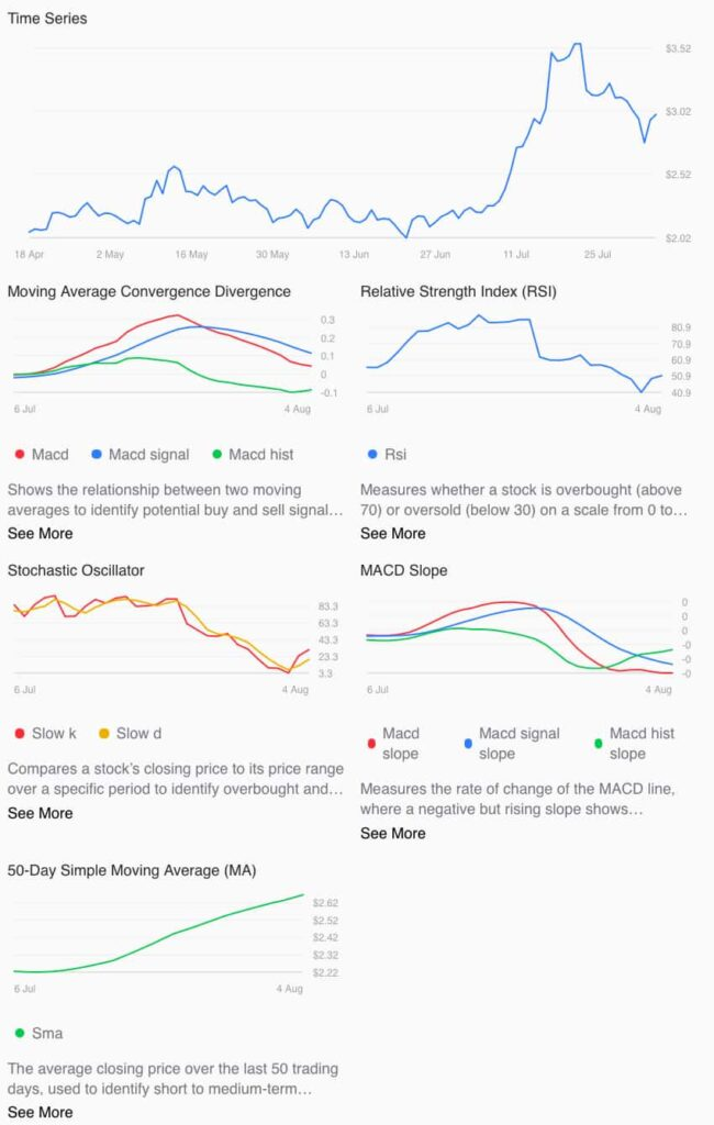 پس از آموزش مدل، با دادههای ورودی جدید (مثلاً دادههای روزانه اخیر، احساسات امروز، حجم معاملات اخیر) پیش بینی انجام میشود. خروجی ممکن است قیمت نقطهای (مثلاً «تا پایان هفته: ۳٫۵ دلار») یا بازه قیمتی با احتمال (مثلاً «با احتمال ۴۰٪ قیمت میتواند تا ۵ دلار برسد») باشد. همچنین ممکن است مدل چند سناریو ارائه کند: بحرانی، میانهرو، رشد بالا.