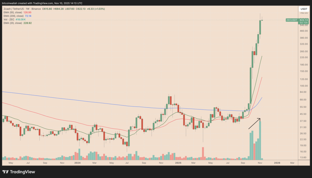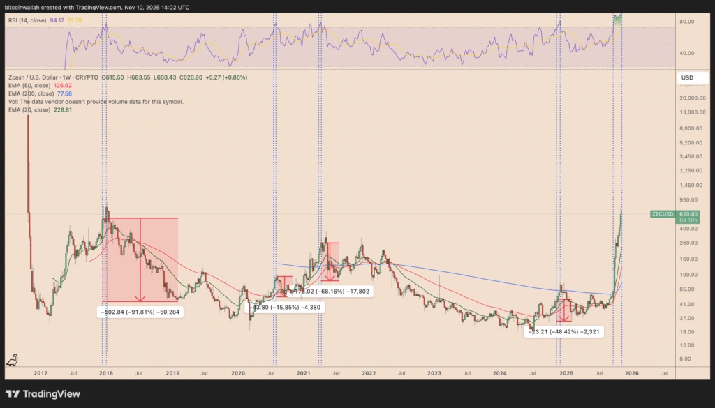 شاخص قدرت نسبی (RSI) هفتگی ZEC این هفته به ۹۴.۲۴، بالاترین عدد ثبت‌شده از زمان ورود این دارایی به بازار رسید. تجربه تاریخی Zcash نشان می‌دهد: