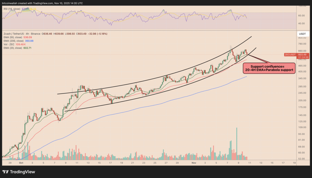 در نمودار ۴ ساعته، ZEC همچنان داخل یک کانال پارابولیک صعودی قرار دارد. اگر قیمت بتواند در محدوده‌ حمایت هم‌زمان EMA-20 و کف کانال دوباره رشد کند، احتمال حرکت دوباره به سمت ۹۰۰ تا ۱۰۰۰ دلار، دقیقاً همان اهدافی که آرتور هیز مطرح کرده بود، وجود دارد.